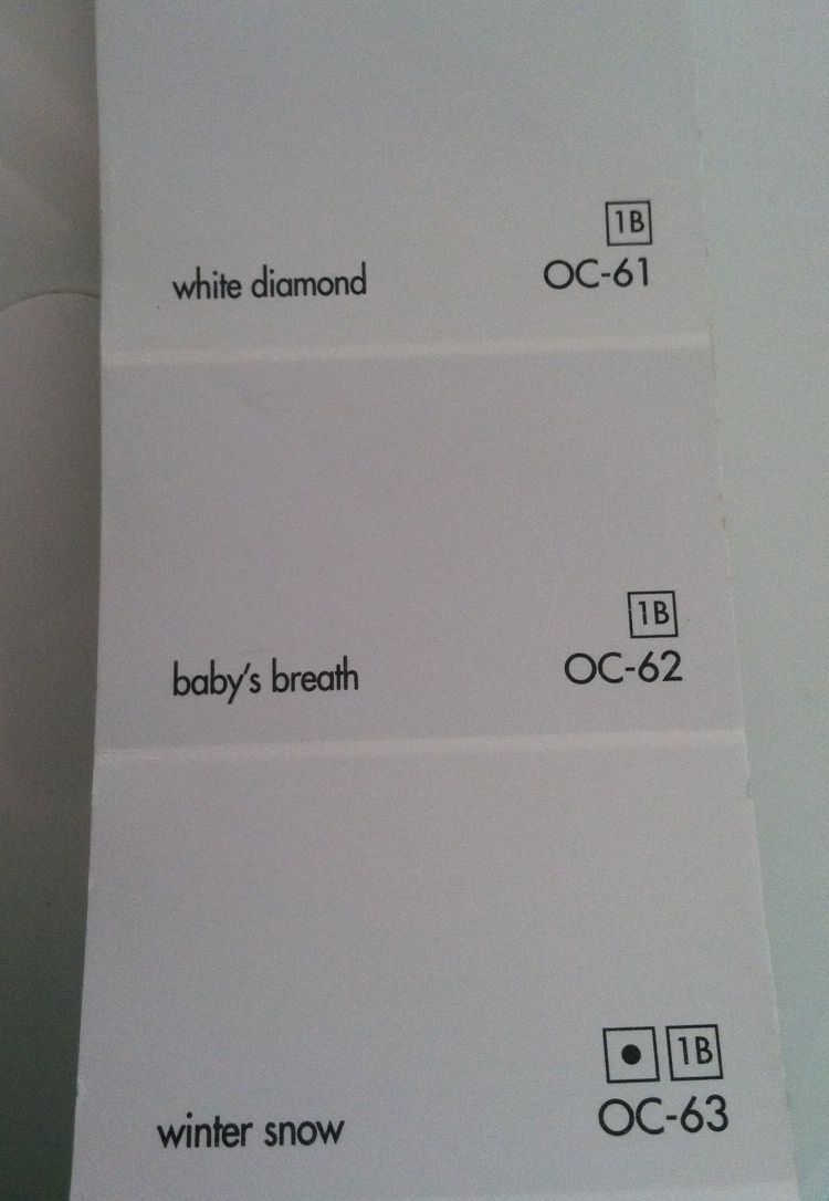 Benjamin Moore White Diamond OC-61, Baby’s Breath OC-62, Winter Snow OC-63
